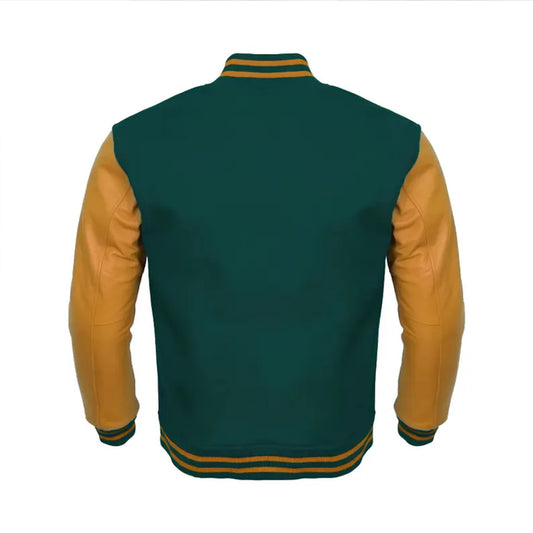 Mens Varsity Letterman Green Body Mustard Yellow leather Sleeves Baseball Jacket Team Varsity Jacket