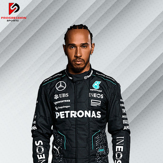 At Progression Sports, we allocated time designing high-end, Mercedes F1 costumes to gift the great team their heritage. These styles, high-fashion F1 Race Suits were inspired by historic F1 Driver Costumes, ones that their champions wear, including Lewis Hamilton and George Russell. Each of these F1 Costumes brings the spirit of speed and innovation to Mercedes. Designed to be comfortable and stylish, for the racing enthusiast looking forward to putting his passion on public display, whether on the track or in the stands cheering from home with our fantastic Mercedes F1 costumes